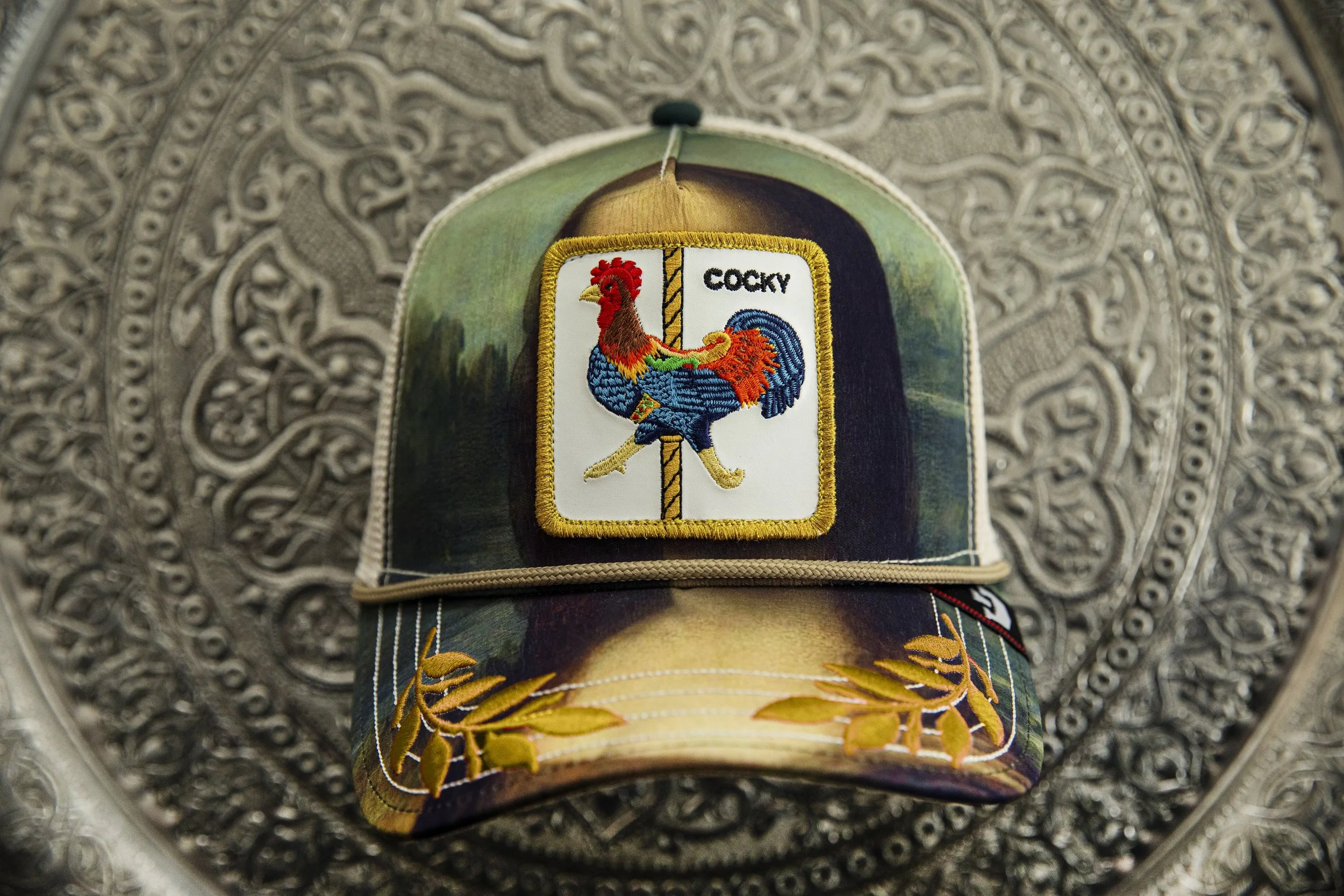 One of my earliest successes in pushing the envelope was Carousel. I wanted to elevate the everyday trucker into something that felt special and premium, but at the same time I was hoping to provide some commentary on the pomp surrounding classic art. No shade to the Mona Lisa, but I think she can afford to lose a peg or two. I printed Renaissance art and combined it with flashy brocades and smooth-grain leathers and then topped each brim with some olive laurel embroidery to really pull the collection together. Initially met with some resistance, this collection was resurrected three times over the following years.